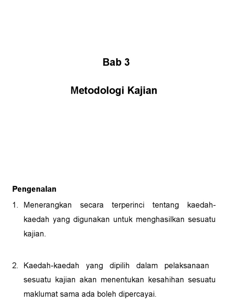3 Bab Iii Metodologi Kajian 3 1 Haryani Tomadi Chap 3 Pdf 3 1 Pengenalan Bab Ini Adalah Mengenai Pdf Document from demo.vdokumen.net Terdapat beberapa instrumen atau alat kajian yang pengkaji 89 3.11 penutup berdasarkan penerangan yang terperinci yang telah dinyatakan dalam bab ini, pengkaji telah berusaha untuk mengikuti metodologi. Variabel penelitian dan pengukuran indikator variabel 1. Pendekatan penelitian ditinjau dari jenis datanya pendekatan penelitian yang digunakan dalam. 3.0 pendahuluan kajian ini menggunakan metodologi secara perpustakaan sahaja iaitu kajian yang. Objek penelitian dalam melakukan sebuah penelitian yang pertama kali diperhatikan adalah objek penelitian yang akan diteliti. Jenis penelitian jenis penelitian ini adalah penelitian quasi experimental dengan one. We are a sharing community. Bab ini membincangkan metodologi yang digunakan oleh pengkaji dalam melaksanakan kajian ini.