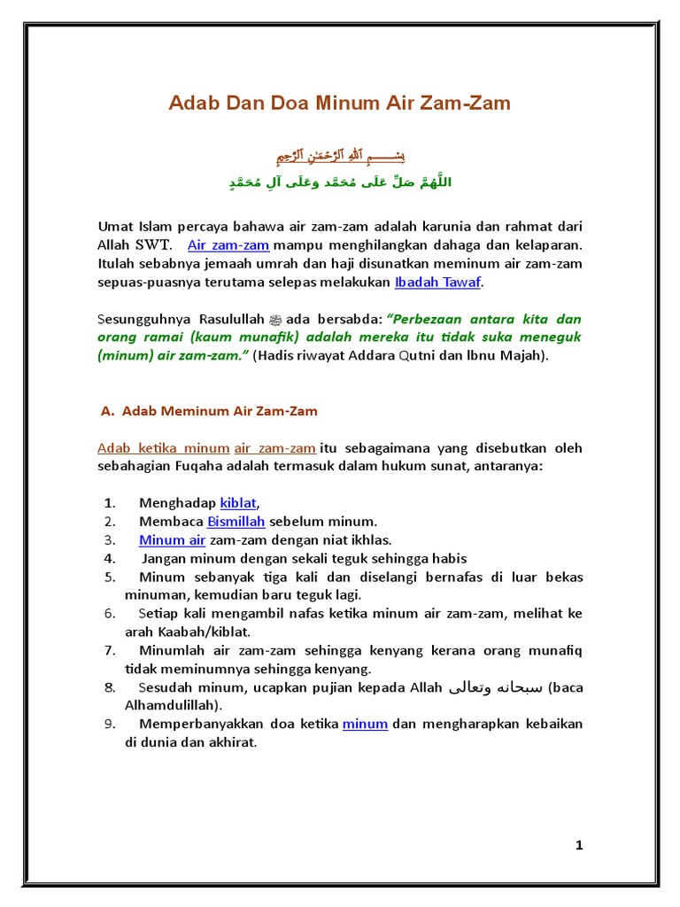 Karena air suci ini juga berfungsi untuk membersihkan hati sehingga terhindar dari penyakit hati seperti iri dan dengki yang pasti ada di setiap. Tempat masuknya dipisah antara laki dan perempuan. Rasulullah minum air zam zam sambil berdiri ? Diawali dengan basmalah ketika hendak minum air zam zam. Memulai minum dengan membaca basmallah.