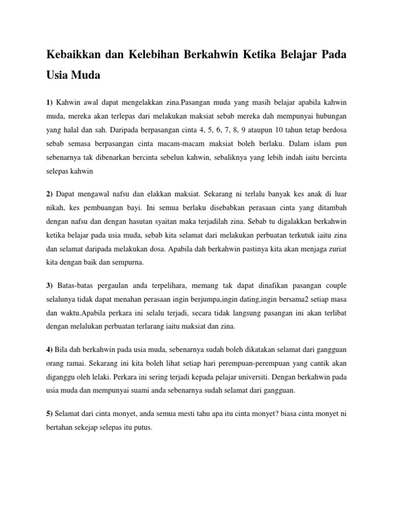 Doc Kahwin Pada Usia Muda Nfa Farhana Academia Edu from 0.academia-photos.com Team wom.my — june 18, 2016. Memasuki gerbang perkahwinan dalam fasa 'orang muda' sering dipandang serong bagi sesetengah pihak. Biasanya mereka tidak bersedia dari segi fizikal mahupun mental untuk menjadi seorang isteri dan ibu, oleh itu mereka terdedah pada risiko kematian semasa beranak, dan kecederaan semasa hamil. Belajar dulu atau kahwin semasa belajar. Siri ini memulakan tayangan perdana di slot iris tv3 dari 22 ogos 2016 hingga 8 september 2016 menggantikan marhaban kome oi. Kahwin muda atau kahwin semasa belajar. Biasanya mentaliti orang kita (khasnya pejuang kahwin muda) anggap kahwin muda tu ialah kahwin di usia muda dalam lingkungan bawah 25 tahun contoh nikah lepas spm ke. Jika selama ini bekerja @ belajar sambil lewa.